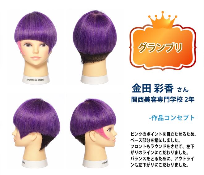 第7回 PEEK-A-BOOウィッグデザインコンテスト(主催:滝川株式会社)の『スチューデント部門』で、KANBI生2年生の金田彩香さんが、見事『グランプリ』に輝きました!!KANBIはなんと4年連続、今回で5連続でグランプリを獲得!!また、デザイン賞を7名が受賞!!今回はデザイン賞受賞9作品中7作品をKANBIが独占するというすばらしい結果となりました。 全国の美容学生が参加し、カットの技術を競い合うこのコンテスト。PEEK-A-BOO代表 川島文夫氏が審査員を務められ、毎年たくさんKANBI生がチャレンジします!