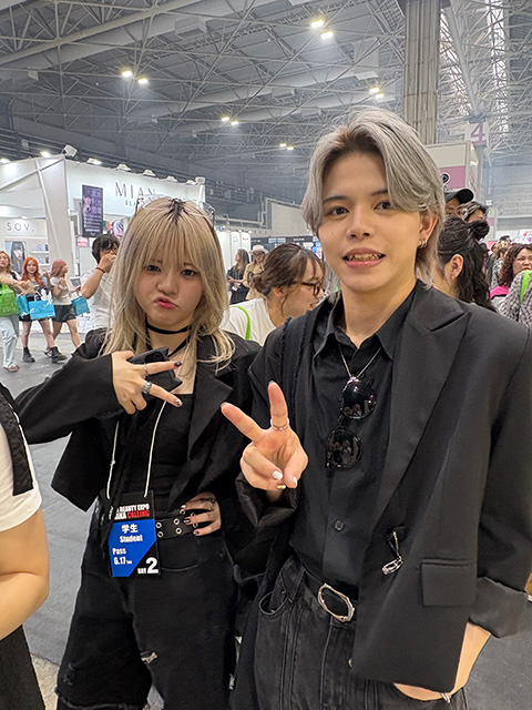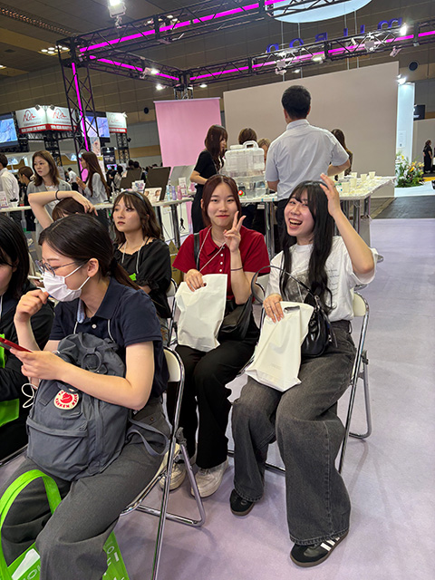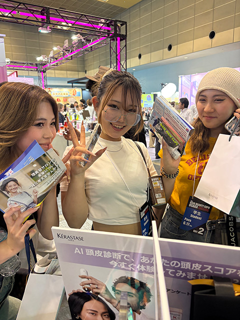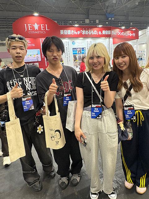 会場内では、多くの有名メーカーやサロンがブースを展開しており、学生たちも積極的に参加。最新の美容機器や商材、カラー剤、スタイリングアイテムなどを実際に手に取り、使い方を学びました。