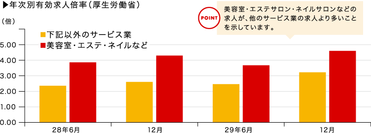有効求人倍率は、求職者一人がその職種に就ける求人の数のことです。つまり、有効求人倍率が2倍なら、1人あたり2件以上の求人がある、という状況を示しています。ここ数年、美容業界を含むサービス業の求人倍率が伸びており、美容業界をめざす人は就職しやすい状況となっています。